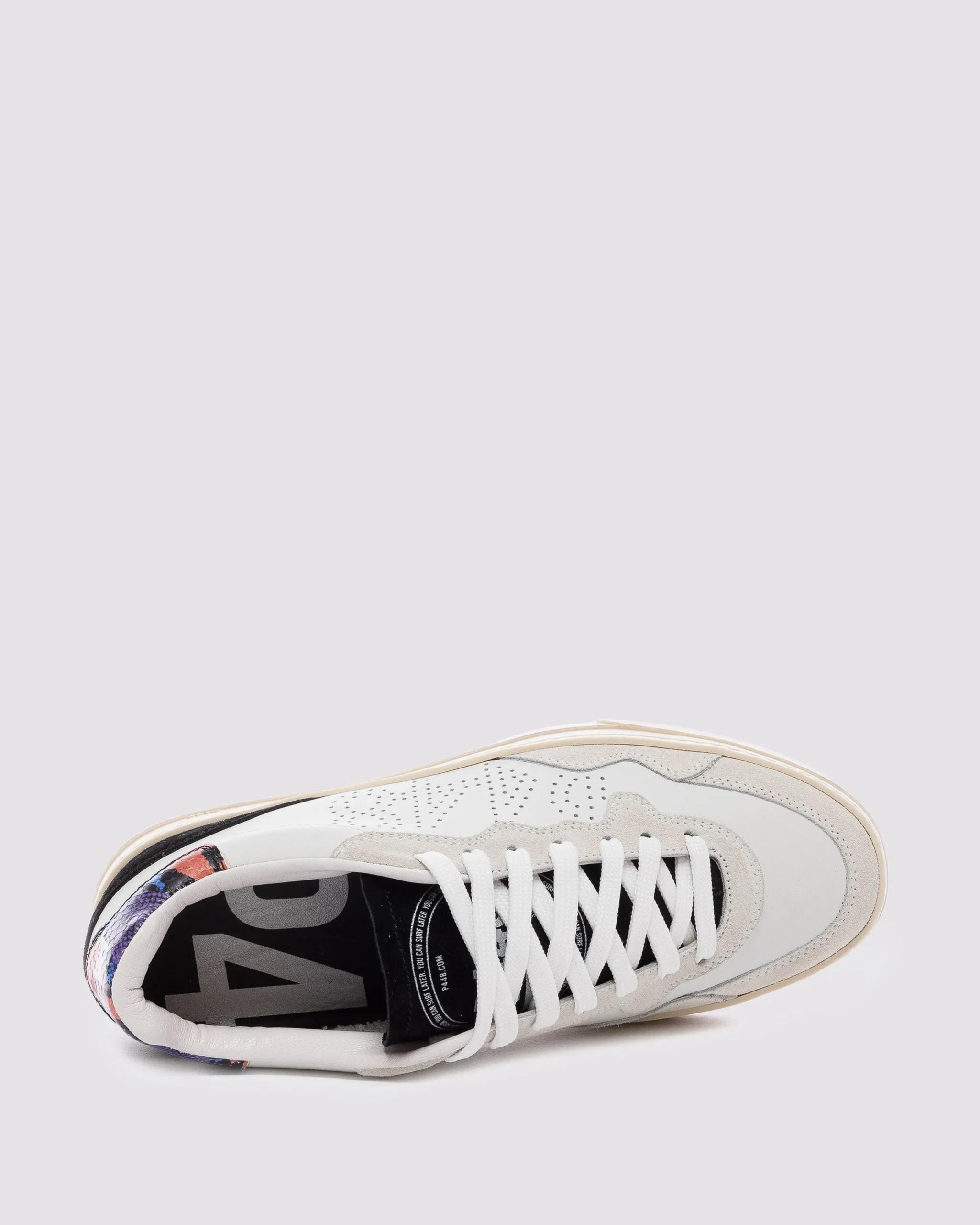 The Bali Glow features white leather, black suede, and white suede details accented by a multicolored animal-print leather heel tab. The hand-distressed sole gives a laidback look, while the fluorescent orange tread adds an unexpected pop of color.